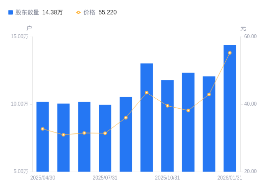 近一年(2025年1月31日至2026年1月31日),南大光电A股股东户数从9.33万户,增加至14.38万户,增幅54.09%,区间股价上涨82.12%。
