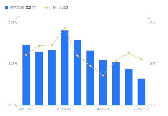 2月12日消息,数据显示,截至2026年2月10日,全通教育A股股东总户数为3.33万户,较上期(2026年1月30日)增加664户,增幅2.03%。公司最新A股总股本为6.33亿股,其中流通A股6.33亿股,户均持有流通A股数量为1.9万股,较上期减少386.3股,降幅1.99%;户均持流通A股市值11.63万元,较上期增加8493.65元,增幅7.88%。