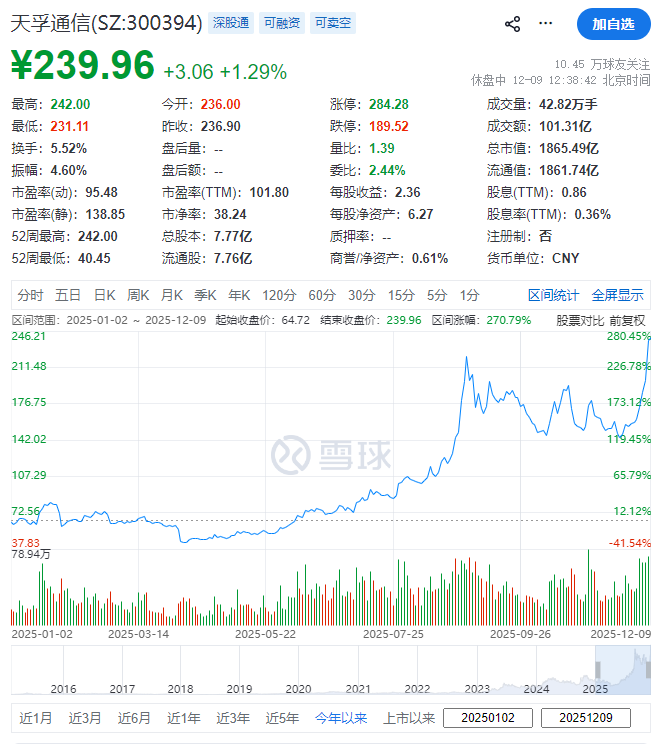 来自江苏苏州的A股上市公司天孚通信(300394.SZ)发布公告称,公司股票交易价格于2025年12月4日、2025年12月5日、2025年12月8日连续3个交易日内收盘价格涨幅偏离值累计超过30%,根据《深圳证券交易所交易规则》有关规定,属于股票交易异常波动的情形。