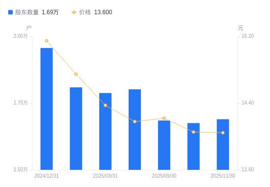 近一年(2024年12月31日至2025年11月30日),迪瑞医疗A股股东户数从1.96万户,减低至1.69万户,降幅13.65%,区间股价下跌19.00%。