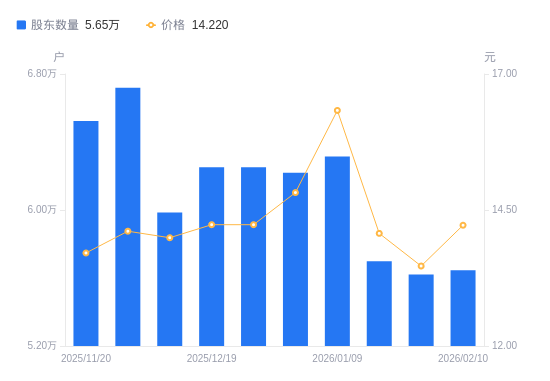 2月11日消息,数据显示,截至2026年2月10日,天和防务A股股东总户数为5.65万户,较上期(2026年1月30日)增加251户,增幅0.45%。公司最新A股总股本为5.18亿股,其中流通A股4.05亿股,户均持有流通A股数量为7166.74股,较上期减少32股,降幅0.44%;户均持流通A股市值10.19万元,较上期增加4943.96元,增幅5.10%。