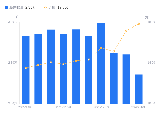 近一年(2025年2月10日至2026年1月30日),花园生物A股股东户数从2.9万户,减低至2.36万户,降幅18.80%,区间股价上涨26.45%。