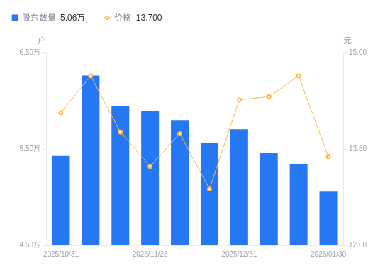 近一年(2025年2月28日至2026年1月30日),汉宇集团A股股东户数从7.41万户,减低至5.06万户,降幅31.74%,区间股价下跌35.04%。
