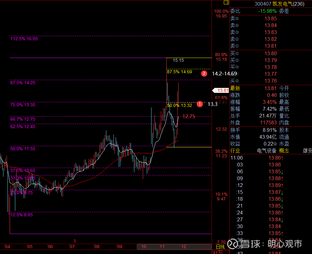 今天在三分位12.37支撑处,修复反抽白线,但未完成突破,K线是孕线止跌信号,但未转多前,不排除还有反复。当前来说,支撑先看12.37,这个位置上先跟踪对 白线12.8的收复,站到12.8上,则低点安全,反弹空间可看13.8;但若击破12.37,就还需下探生命线11....