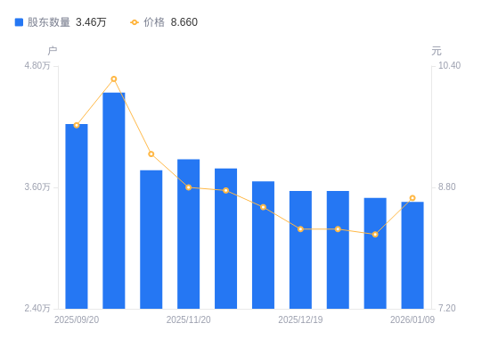 1月12日消息,数据显示,截至2026年1月9日,正业科技A股股东总户数为3.46万户,较上期(2025年12月31日)减少396户,降幅1.13%。公司最新A股总股本为3.67亿股,其中流通A股3.67亿股,户均持有流通A股数量为1.06万股,较上期增加120.24股,增幅1.15%;户均持流通A股市值9.2万元,较上期增加6080.32元,增幅7.08%。