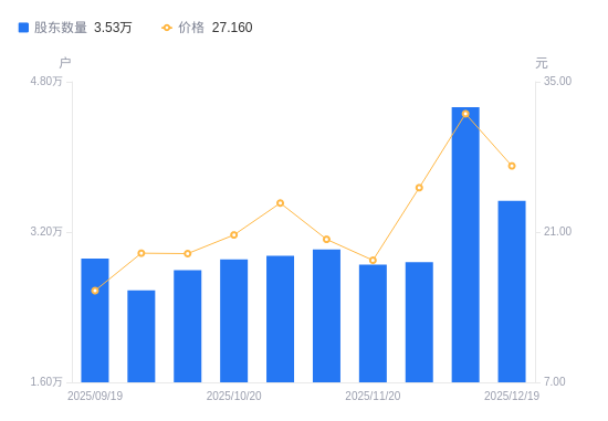 1月6日消息,数据显示,截至2025年12月31日,力星股份A股股东总户数为5.44万户,较上期(2025年12月19日)增加1.91万户,增幅54.07%。公司最新A股总股本为2.94亿股,其中流通A股2.3亿股,户均持有流通A股数量为4233.88股,较上期减少2289.23股,降幅35.09%;户均持流通A股市值15.57万元,较上期减少2.14万元,降幅12.10%。