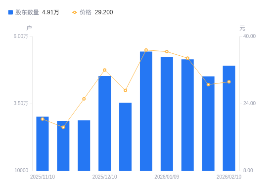 2月25日消息,数据显示,截至2026年2月10日,力星股份A股股东总户数为4.91万户,较上期(2026年1月31日)增加3950户,增幅8.75%。公司最新A股总股本为2.94亿股,其中流通A股2.3亿股,户均持有流通A股数量为4692.47股,较上期减少410.64股,降幅8.05%;户均持流通A股市值13.7万元,较上期减少8571.47元,降幅5.89%。