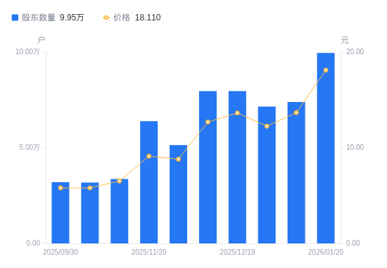 1月26日消息,数据显示,截至2026年1月20日,红相股份A股股东总户数为9.95万户,较上期(2026年1月9日)增加2.56万户,增幅34.72%。公司最新A股总股本为5.09亿股,其中流通A股5.03亿股,户均持有流通A股数量为5054.21股,较上期减少1754.93股,降幅25.77%;户均持流通A股市值9.15万元,较上期减少1549.25元,降幅1.66%。