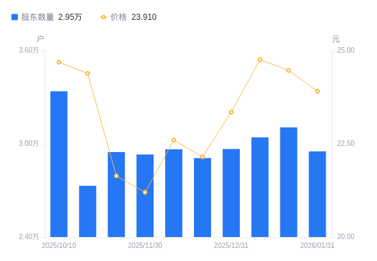 近一年(2025年2月20日至2026年1月31日),立中集团A股股东户数从2.51万户,增加至2.95万户,增幅17.73%,区间股价上涨35.59%。