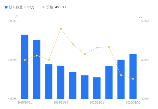 近一年(2025年2月20日至2026年1月30日),鹏辉能源A股股东户数从8.1万户,减低至6.32万户,降幅21.98%,区间股价上涨46.17%。