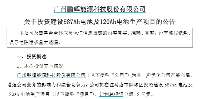 根据公告,鹏辉能源拟在驻马店市驿城区投资建设587Ah电池及120Ah电池生产项目,计划总投资金额12亿元。该项目实施主体为河南省鹏辉电源有限公司。