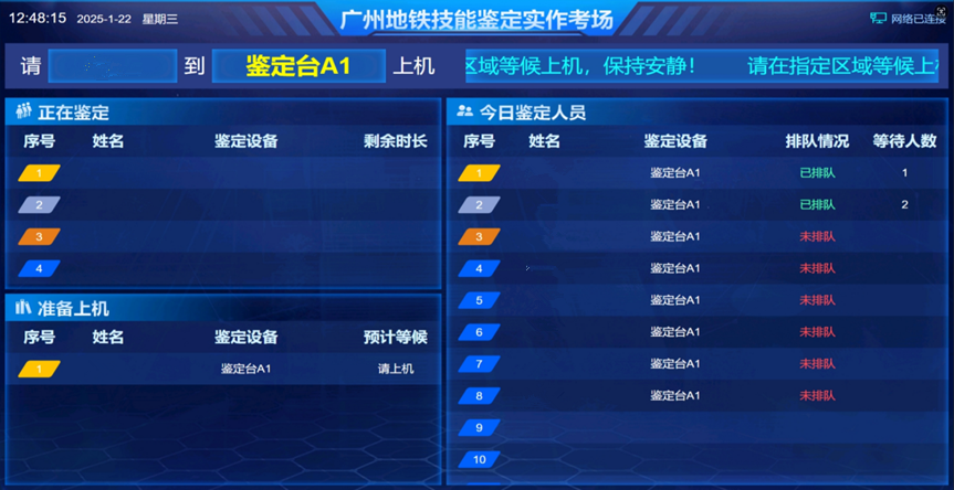 综合信息管理平台与教员控制台,实现对鉴定现场的集中智能管控。平台支持一键创建鉴定计划,自动关联考生信息、考评课程、设备资源与考评方案。通过高清视频监控系统,考评员可实时查看各工位操作画面;智能排队叫号系统根据鉴定计划自动分配设备,考生通过指纹或人脸识别完成身份验证后,系统自动引导,实现候考流程的智能化管理。