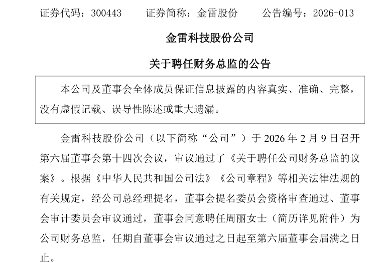 公告披露,金雷股份于2026年2月9日召开第六届董事会第十四次会议,审议通过了《关于聘任公司财务总监的议案》。根据《中华人民共和国公司法》《公司章程》等相关法律法规的有关规定,经公司总经理提名,董事会提名委员会资格审查通过、董事会审计委员会审议通过,董事会同意聘任周丽女士为公司财务总监,任期自董事会审议通过之日起至第六届董事会届满之日止。