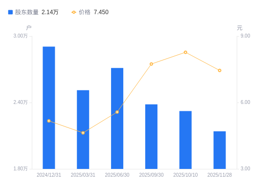 近一年(2024年12月31日至2025年11月28日),星徽股份A股股东户数从2.91万户,减低至2.14万户,降幅26.37%,区间股价上涨38.73%。