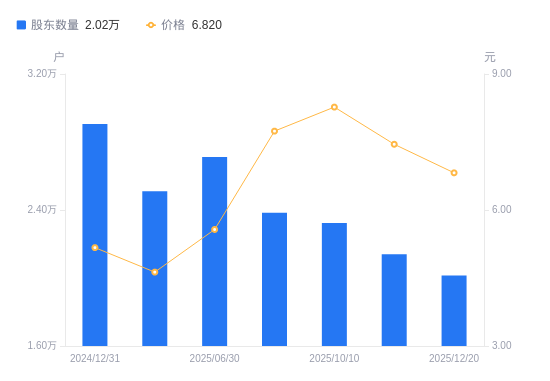 12月23日消息,数据显示,截至2025年12月20日,星徽股份A股股东总户数为2.02万户,较上期(2025年11月28日)减少1240户,降幅5.80%。公司最新A股总股本为4.58亿股,其中流通A股3.55亿股,户均持有流通A股数量为1.76万股,较上期增加1022.11股,增幅6.15%;户均持流通A股市值12.03万元,较上期减少3494.11元,降幅2.82%。