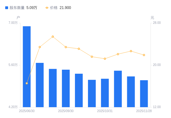 近一年(2024年12月31日至2025年11月28日),高伟达A股股东户数从8.2万户,减低至5.09万户,降幅37.90%,区间股价上涨8.74%。