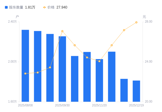 近一年(2024年12月20日至2025年12月19日),迅游科技A股股东户数从2.31万户,减低至1.81万户,降幅21.59%,区间股价上涨53.26%。