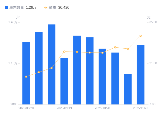 近一年(2024年11月20日至2025年11月20日),杭州高新A股股东户数从7821户,增加至1.26万户,增幅61.58%,区间股价上涨184.03%。