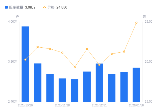2月4日消息,数据显示,截至2026年1月30日,东杰智能A股股东总户数为3.08万户,较上期(2026年1月20日)增加922户,增幅3.08%。公司最新A股总股本为4.77亿股,其中流通A股4.77亿股,户均持有流通A股数量为1.55万股,较上期减少477.16股,降幅2.99%;户均持流通A股市值38.5万元,较上期增加4.57万元,增幅13.47%。