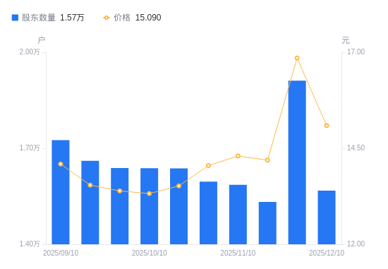 近一年(2024年12月20日至2025年12月10日),启迪设计A股股东户数从1.48万户,增加至1.57万户,增幅5.77%,区间股价上涨20.43%。