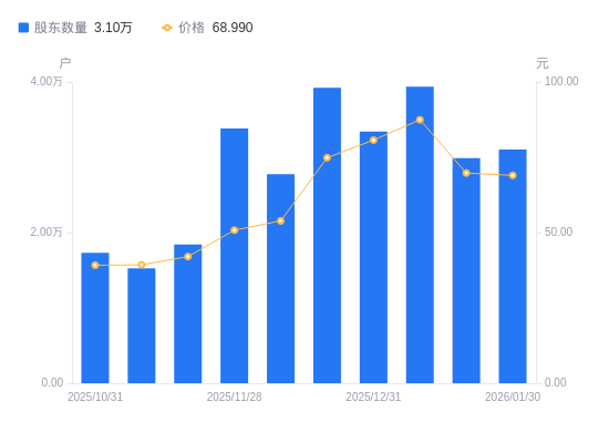 2月2日消息,数据显示,截至2026年1月30日,久之洋A股股东总户数为3.1万户,较上期(2026年1月20日)增加1151户,增幅3.85%。公司最新A股总股本为1.8亿股,其中流通A股1.8亿股,户均持有流通A股数量为5802.15股,较上期减少223.56股,降幅3.71%;户均持流通A股市值40.03万元,较上期减少2.01万元,降幅4.77%。