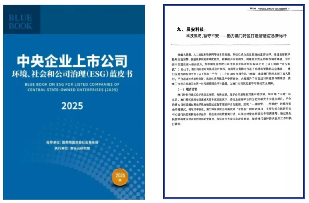 其中,辰安科技(300523)提供的ESG实践案例《科技筑防,智守平安——助力澳门特区打造智慧应急新标杆》,成功入选《中央企业上市公司环境、社会和企业治理(ESG)蓝皮书(2025)》。