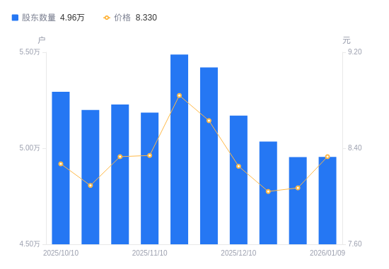 近一年(2025年1月20日至2026年1月9日),ST应急A股股东户数从4.99万户,减低至4.96万户,降幅0.75%,区间股价上涨7.25%。