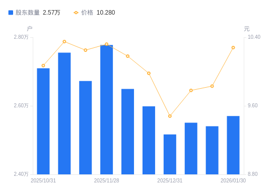 2月11日消息,数据显示,截至2026年2月10日,陇神戎发A股股东总户数为2.84万户,较上期(2026年1月30日)增加2735户,增幅10.64%。公司最新A股总股本为3.03亿股,其中流通A股3.02亿股,户均持有流通A股数量为1.06万股,较上期减少1130.2股,降幅9.62%;户均持流通A股市值11.21万元,较上期减少8750.68元,降幅7.24%。