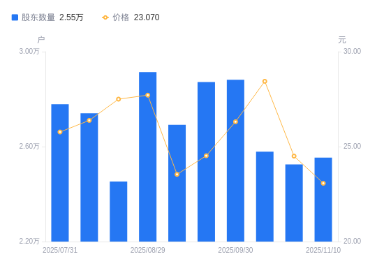 近一年(2024年12月20日至2025年11月10日),广信材料A股股东户数从3.52万户,减低至2.55万户,降幅27.51%,区间股价上涨12.15%。
