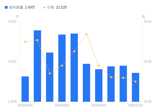12月2日消息,数据显示,截至2025年11月28日,广信材料A股股东总户数为2.49万户,较上期(2025年11月20日)减少725户,降幅2.83%。公司最新A股总股本为2.08亿股,其中流通A股1.44亿股,户均持有流通A股数量为5784.77股,较上期增加163.79股,增幅2.91%;户均持流通A股市值13.03万元,较上期增加1046.79元,增幅0.81%。
