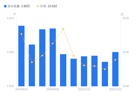 近一年(2024年12月20日至2025年12月10日),广信材料A股股东户数从3.52万户,减低至2.6万户,降幅26.08%,区间股价上涨16.24%。