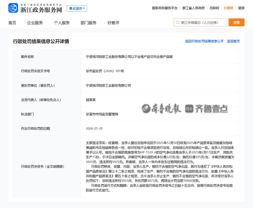 近日,齐鲁晚报·齐鲁壹点记者从浙江政务服务网获悉,宁波横河精密(300539)工业股份有限公司因生产、销售不合格的空气净化器,被慈溪市市场监督管理局没收违法所得5925元,并处罚款4075元,两项合计罚没款10000元整。