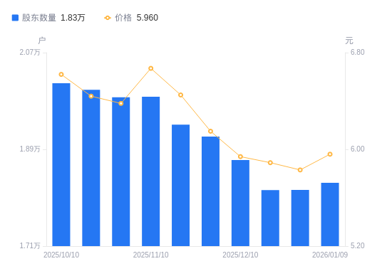 近一年(2025年1月27日至2026年1月9日),中旗股份A股股东户数从1.64万户,增加至1.83万户,增幅11.49%,区间股价上涨3.83%。