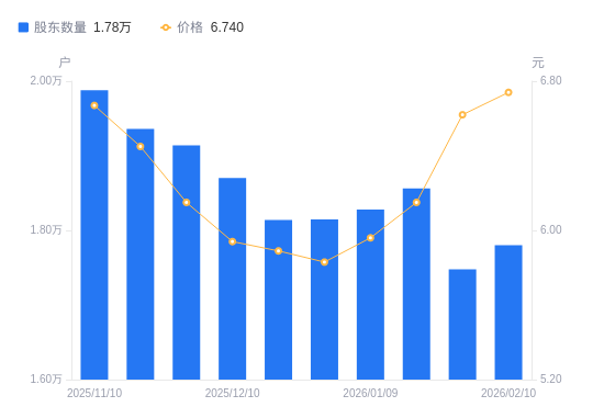 近一年(2025年2月28日至2026年2月10日),中旗股份A股股东户数从1.58万户,增加至1.78万户,增幅12.58%,区间股价上涨10.31%。