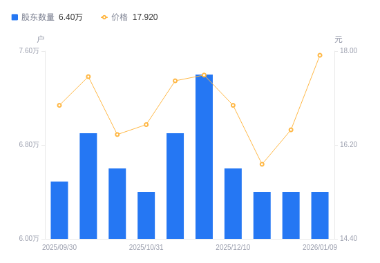1月15日消息,数据显示,截至2026年1月9日,晨曦航空A股股东总户数为6.4万户,较上期(2025年12月31日)不变。公司最新A股总股本为5.5亿股,其中流通A股5.5亿股,户均持有流通A股数量为8595.46股,较上期不变;户均持流通A股市值15.4万元,较上期增加1.23万元,增幅8.67%。