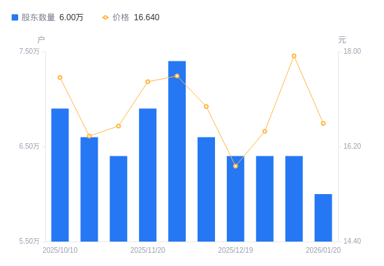 1月22日消息,数据显示,截至2026年1月20日,晨曦航空A股股东总户数为6万户,较上期(2026年1月9日)减少4000户,降幅6.25%。公司最新A股总股本为5.5亿股,其中流通A股5.5亿股,户均持有流通A股数量为9168.49股,较上期增加573.03股,增幅6.67%;户均持流通A股市值15.26万元,较上期减少1466.96元,降幅0.95%。