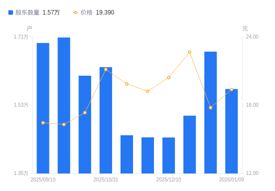 1月14日消息,数据显示,截至2026年1月9日,奥联电子A股股东总户数为1.57万户,较上期(2025年12月31日)减少986户,降幅5.90%。公司最新A股总股本为1.71亿股,其中流通A股1.71亿股,户均持有流通A股数量为1.09万股,较上期增加641.64股,增幅6.27%;户均持流通A股市值21.09万元,较上期增加2.88万元,增幅15.83%。