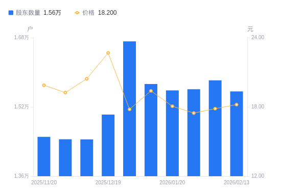 近一年(2025年2月28日至2026年2月13日),奥联电子A股股东户数从1.69万户,减低至1.56万户,降幅7.91%,区间股价上涨5.94%。