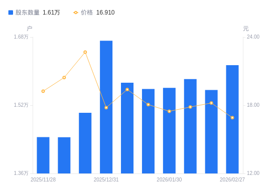 3月3日消息,数据显示,截至2026年2月27日,奥联电子A股股东总户数为1.61万户,较上期(2026年2月13日)增加584户,增幅3.75%。公司最新A股总股本为1.71亿股,其中流通A股1.71亿股,户均持有流通A股数量为1.06万股,较上期减少397.91股,降幅3.62%;户均持流通A股市值17.93万元,较上期减少2.09万元,降幅10.45%。