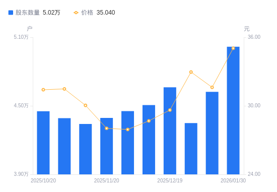 近一年(2025年2月10日至2026年1月30日),飞荣达A股股东户数从4.07万户,增加至5.02万户,增幅23.18%,区间股价上涨69.59%。