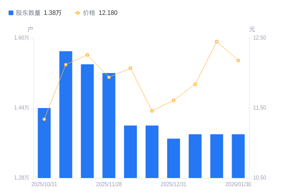 近一年(2025年2月10日至2026年1月30日),晨化股份A股股东户数从1.46万户,减低至1.38万户,降幅5.48%,区间股价上涨24.15%。