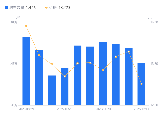 1月6日消息,数据显示,截至2025年12月19日,欣天科技A股股东总户数为1.47万户,较上期(2025年12月10日)减少496户,降幅3.26%。公司最新A股总股本为1.93亿股,其中流通A股1.25亿股,户均持有流通A股数量为8496.87股,较上期增加276.59股,增幅3.36%;户均持流通A股市值11.23万元,较上期减少4070.5元,降幅3.50%。