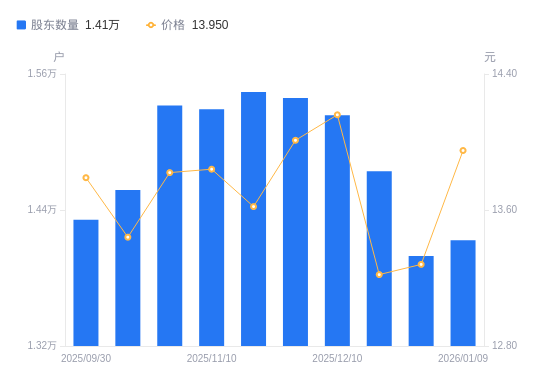 近一年(2025年1月10日至2026年1月9日),欣天科技A股股东户数从2.24万户,减低至1.41万户,降幅36.97%,区间股价下跌10.98%。