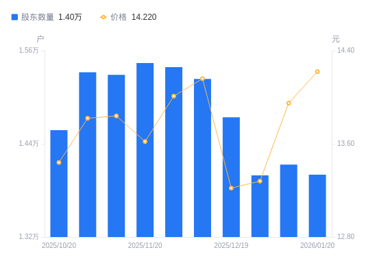近一年(2025年1月20日至2026年1月20日),欣天科技A股股东户数从1.92万户,减低至1.4万户,降幅27.17%,区间股价上涨12.41%。