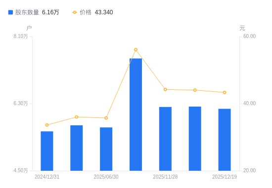 12月23日消息,数据显示,截至2025年12月19日,寒锐钴业A股股东总户数为6.16万户,较上期(2025年12月10日)减少581户,降幅0.93%。公司最新A股总股本为3.1亿股,其中流通A股2.72亿股,户均持有流通A股数量为4422.57股,较上期增加41.31股,增幅0.94%;户均持流通A股市值19.17万元,较上期减少1232.56元,降幅0.64%。