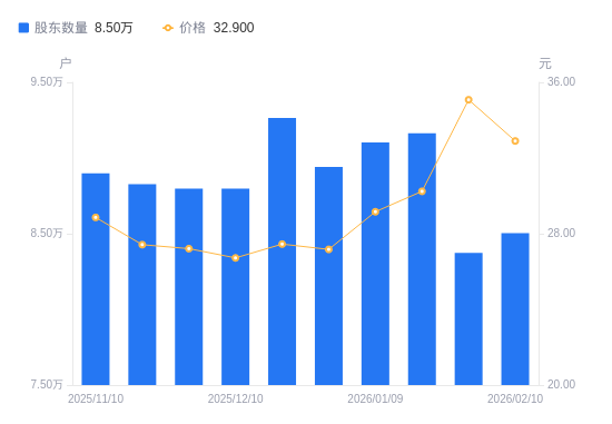 2月11日消息,数据显示,截至2026年2月10日,捷捷微电A股股东总户数为8.5万户,较上期(2026年1月30日)增加1303户,增幅1.56%。公司最新A股总股本为8.32亿股,其中流通A股7.67亿股,户均持有流通A股数量为9023.81股,较上期减少140.41股,降幅1.53%;户均持流通A股市值29.69万元,较上期减少2.46万元,降幅7.65%。