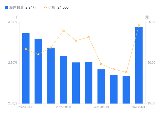 2月7日消息,数据显示,截至2026年1月30日,新劲刚A股股东总户数为2.94万户,较上期(2025年11月28日)增加6034户,增幅25.78%。公司最新A股总股本为2.51亿股,其中流通A股2.17亿股,户均持有流通A股数量为7362.74股,较上期减少1897.77股,降幅20.49%;户均持流通A股市值18.11万元,较上期增加6562.81元,增幅3.76%。