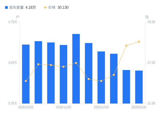 近一年(2025年1月20日至2026年1月20日),彩讯股份A股股东户数从4.12万户,增加至4.16万户,增幅0.91%,区间股价上涨48.49%。