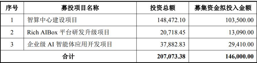 此次募集资金将用于智算中心建设项目、RichAIBox平台研发升级项目和企业级AI智能体应用开发项目。