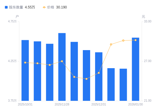 2月2日消息,数据显示,截至2026年1月30日,彩讯股份A股股东总户数为4.55万户,较上期(2026年1月20日)增加3916户,增幅9.42%。公司最新A股总股本为4.51亿股,其中流通A股4.35亿股,户均持有流通A股数量为9557.37股,较上期减少900.67股,降幅8.61%;户均持流通A股市值28.85万元,较上期减少2.66万元,降幅8.43%。